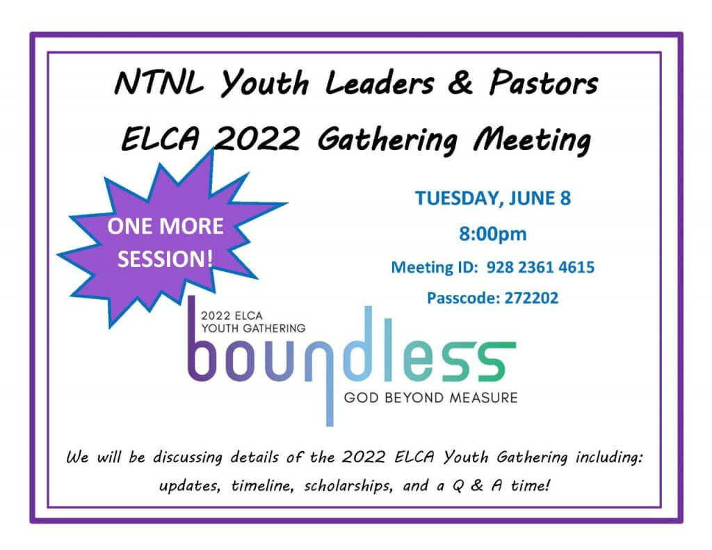 Last Thursday I had the opportunity to participate in one of our NT-NL 2022 ELCA Youth Gathering information sessions. Due to demand, a third information session has been scheduled for tonight, June 8th at 8pm. The information is below. I encourage anyone interested in learning about the gathering to please take note of this option. The ELCA Youth Gathering is an amazing experience for young people and their adult leaders. NT-NL is blessed to have Janelle Miller (Calvary, Richland Hills) as our synod gathering coordinator and the Rev. Adam Stockton (Rejoice, Frisco) as our Synod Day coordinator. These leaders will help us to have an amazing experience. There will again be a bishop’s group (for congregations with 3 or less participants and lacking an adult leader) so if you are interested in that opportunity, please contact me at BpGronberg@ntnl.org. Please take advantage of this unique and amazing experience offered to our young people.