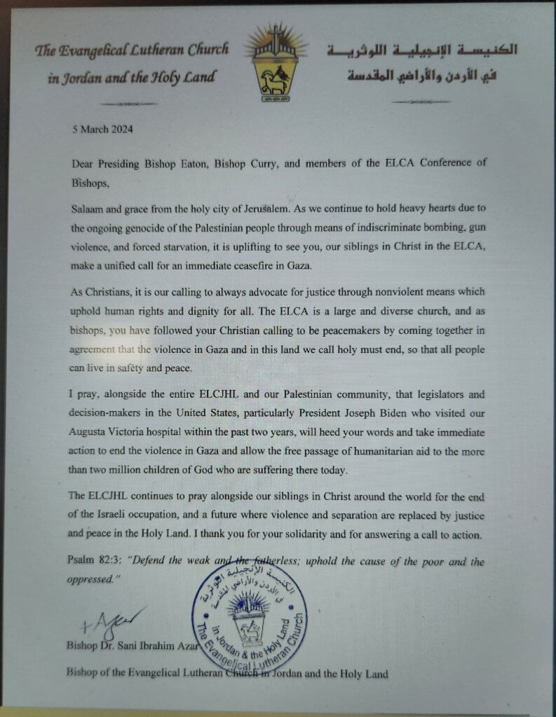 When we make such statements we do so informed not by United States partisan politics but by our ELCA Social statements and commitments to peace in the Holy Land. We also do so in conversation with our partners in the Evangelical Lutheran Church in Jordan and the Holy Land. Lutheran Christians living in the Holy Land, ministering to those in the West Bank and Gaza and who know first hand the horrors of this war. A letter of gratitude from Bishop Azar is the picture below.
