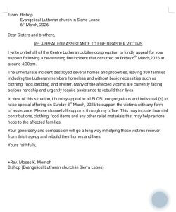 On Friday March 6th a fire broke out on the hill where the Jubilee Center is located in Freetown, Sierra Leone. The fire thankfully did not reach the Jubilee Center but it did destroy properties leaving 300 individuals, including 10 Lutheran families, homeless and with all their belongings destroyed. Bishop Momoh has send a request for support for these families to the congregations and people of the ELCSL. As partners in mission we hear this call and today I have authorized $10,000 to be sent to the ELCSL for this relief.