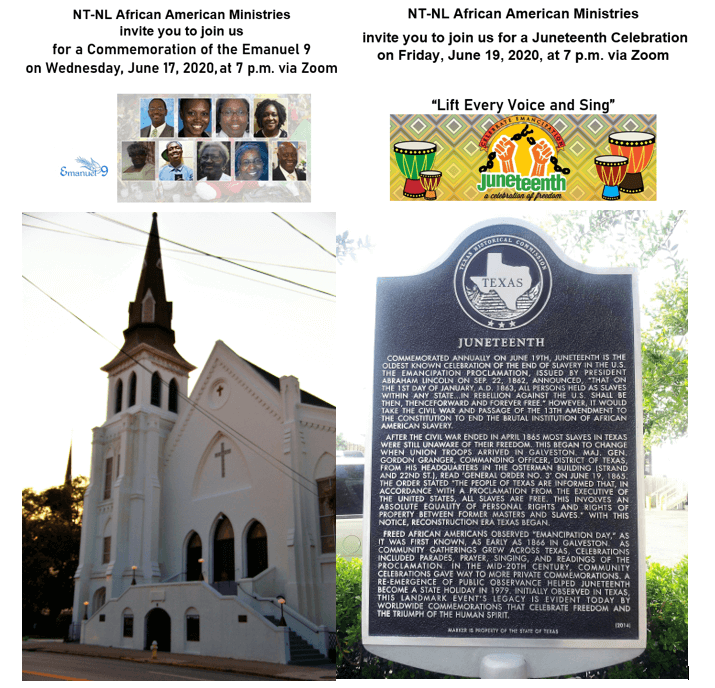 Christ, the Living Word of God, died so that all people might know the joy of freedom. Not only the freedom from bondage that the word of Juneteenth brought but also a freedom from sin and death that invites us to love our neighbor and give our freedom away for our neighbor. To do this well, we must listen and learn, and so I invite you to please join your African descent NT-NL community this week as we engage these two vital days in the life of our church.