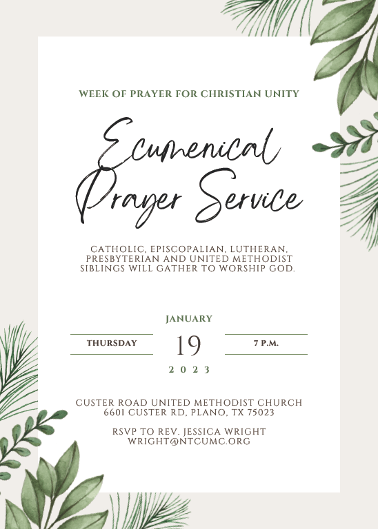 The North Texas Conference of the UMC will host an Ecumenical Worship Service at 7 p.m. on Jan. 19 at Custer Road UMC, 6601 Custer Road, Plano, TX 75023. The NTC will gather with its Lutheran, Presbyterian, Episcopalian, and Catholic siblings to worship God together. Please RSVP to Rev. Jessica Wright: WRIGHT@NTCUMC.ORG