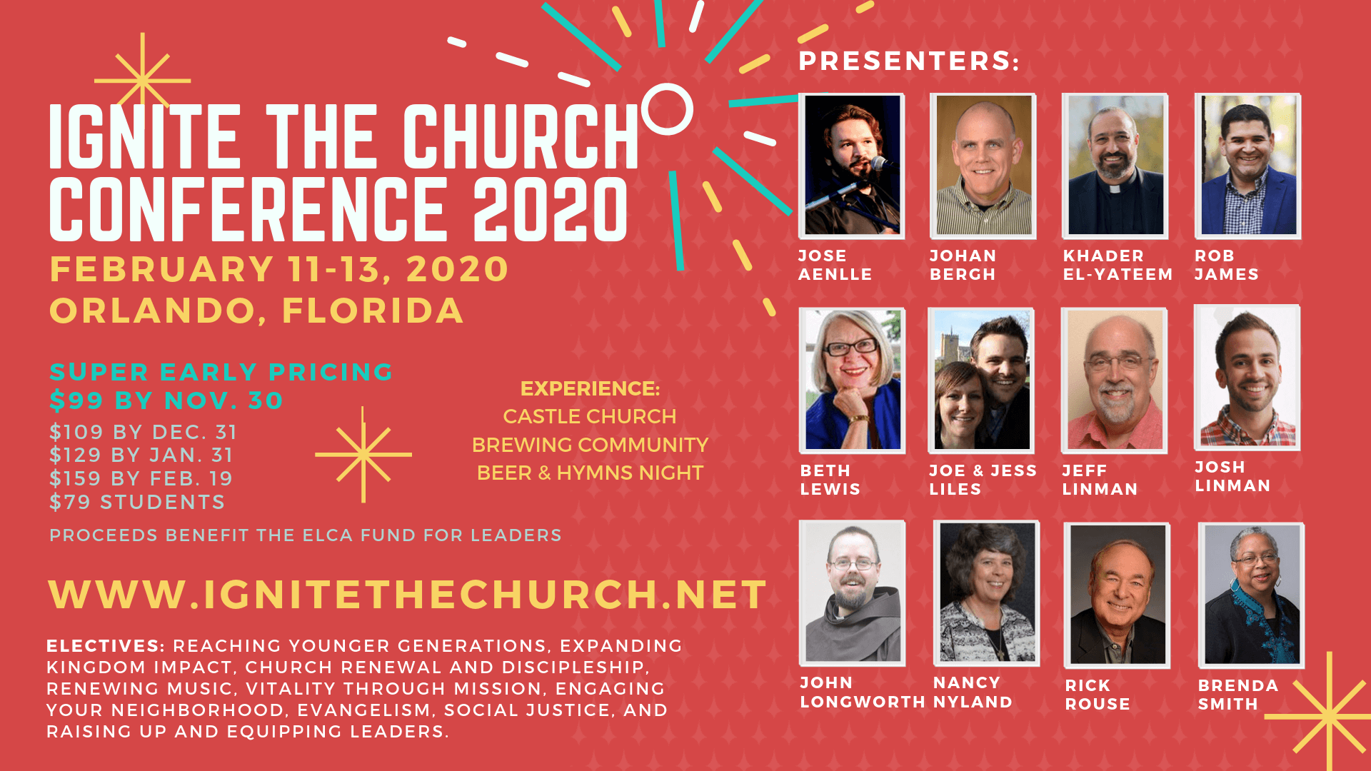 Get inspired, encouraged, challenged and warmed up at the Ignite the Church Conference in Orlando, Florida, February 11-13, 2020. In addition to large group gatherings on Congregational Vitality, there will be electives on Reaching Younger Generations, Expanding Kingdom Impact, Church Renewal and Discipleship, Renewing Music, Vitality through Mission, Engaging Your Neighborhood, Evangelism, Social Justice, and Raising Up Leaders, along with a visit to Orlando’s Castle Church Brewing Community.