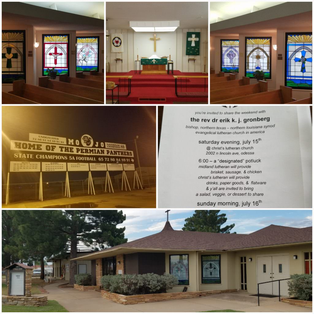 It’s a 650-mile round trip from Fort Worth to Midland/Odessa, the farthest west mission outposts of our Synod. Between Christ’s Lutheran in Odessa and El Paso, a distance of another 300 miles, there is no ELCA congregation and frankly little settlement of significant size. The El Paso congregations are so remote from us they chose, in 1988 when the ELCA was founded, to be a part of the Rocky Mountain Synod, headquartered in Denver. It made more geographic (Denver is closer to El Paso than DFW) and time zone sense.