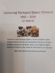 I learned about a long time ministry they did for decades during which members made over 54,000 stuffed animals to donate to Parkland Hospital for sick and injured children. That number just blew me away.