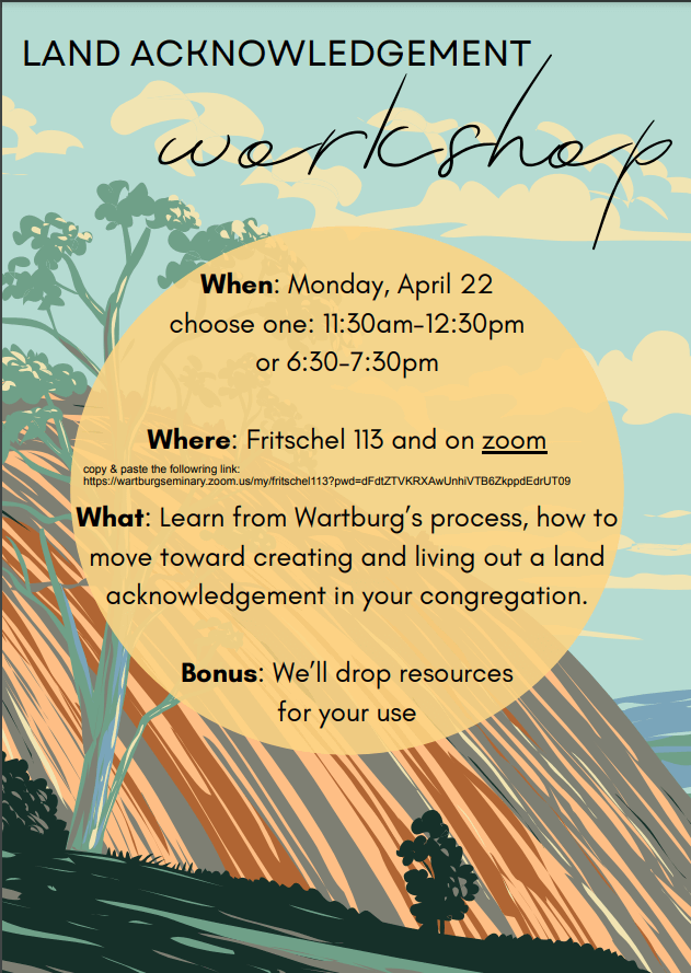 Join Wartburg Seminary via Zoom on April 22nd to learn from Wartburg’s process, how to move toward creating and living out a land acknowledgement in your congregation. You can join via Zoom clicking here.