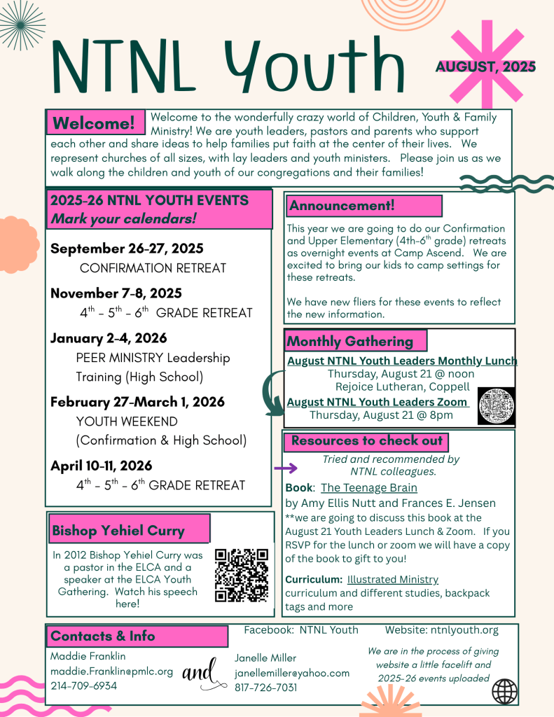 - August 21: NT-NL Youth Leader Lunch, Rejoice, Coppell