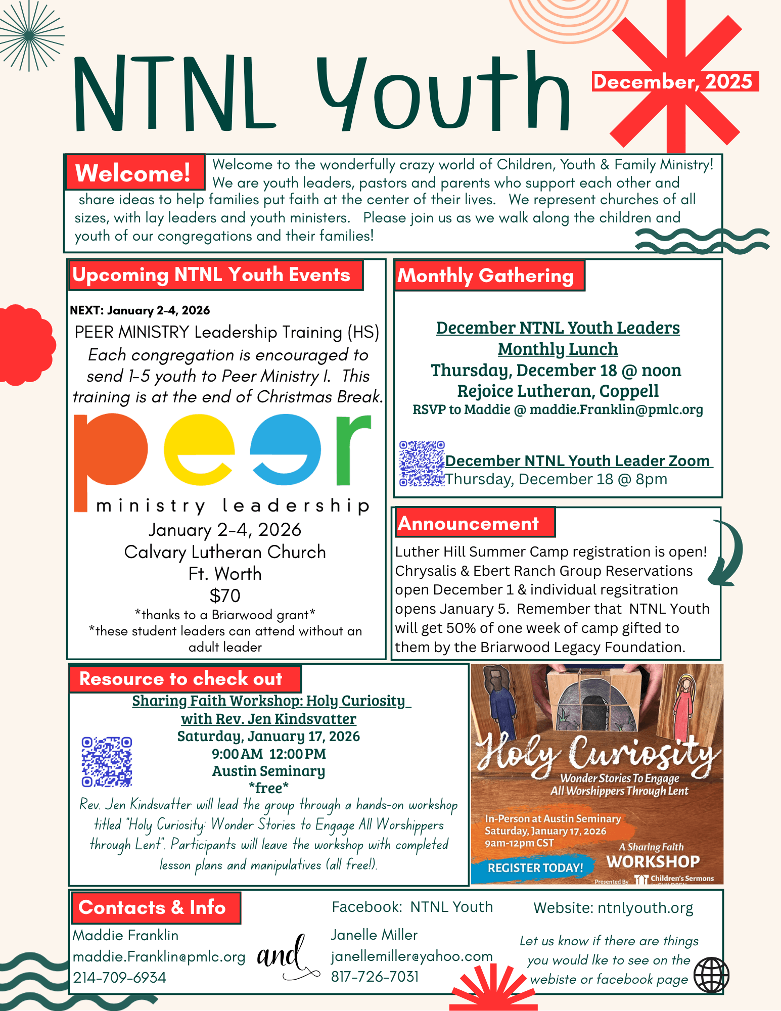 - December 18: NT-NL Youth Leader Lunch, Rejoice, Coppell