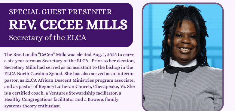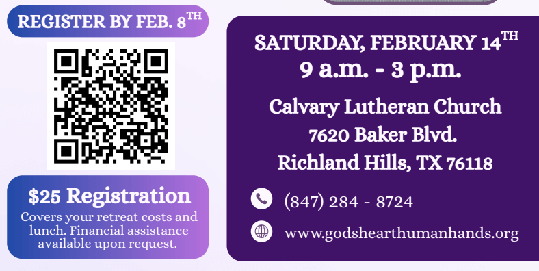 You are invited to join Calvary, Richland Hills on Saturday, February 14th from 9a – 3p (7620 Baker Blvd., Richland Hills, TX 76118) for a day of rest, reverence, and recommitment to the renewing power of the season of Lent. Calvary is welcoming The Rev. Lucille “CeCee” Mills to lead their 2026 Lenten Retreat themed “Preparing for Wilderness: Go to the Ant, You Sluggard” on the wisdom of Proverbs 6:6-8. Pr. Mills serves as Secretary of the ELCA, as well as being a certified coach, a Ventures Stewardship facilitator, a Healthy Congregations facilitator and a Bowens Family Systems theory enthusiast. Your $25 registration fee covers the cost of attendance and lunch. Financial aid is available upon request. Register here or at godshearthumanhands.org.