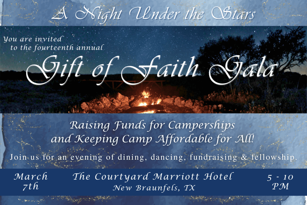 You are invited to join Cross Trails Ministries for a night of dining, dancing, fundraising, and fellowship! This annual event helps us raise the funds for Camperships and help keep camp affordable for all! This year’s event will be held on March 7th at the Courtyard Marriott Hotel in New Braunfels, TX from 5pm-10pm. Tickets are on sale now!