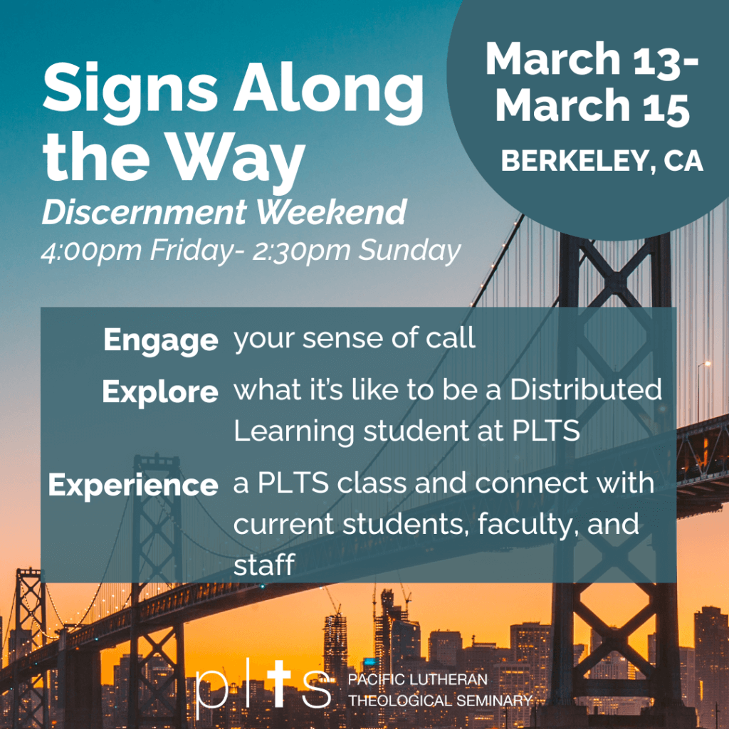 Are you wondering if seminary might be right for you? Consider joining PLTS visit and discernment weekend, Signs Along the Way, March 13th – 15th in Berkeley, California. This weekend is a great opportunity to connect with others in discernment, get to know PLTS faculty, and explore what it’s like to be an online student in the MDiv, MA in Spirituality and Social Change, or Lutheran Year programs. As PLTS transitions to solely offering online study with in-person intensives, this weekend is designed for folks interested in online seminary education. PLTS covers lodging and meals during the event and can offer travel assistance for those who need it.