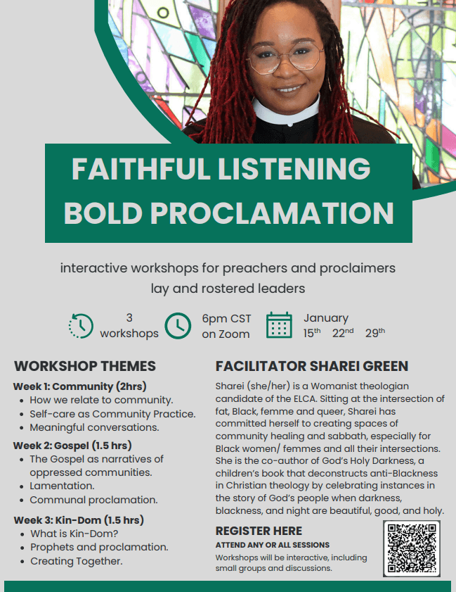 The Initiative is hosting a series of interactive workshops for lay leaders, SAWLs and rostered leaders in January and would like to invite you to attend! The theme of the workshops are Community, Gospel and Kin-dom. The workshops will be participatory Zoom session facilitated by author and theologian Sharei Green. Participates may go to just one session or all of them. Each workshop will have independent content.