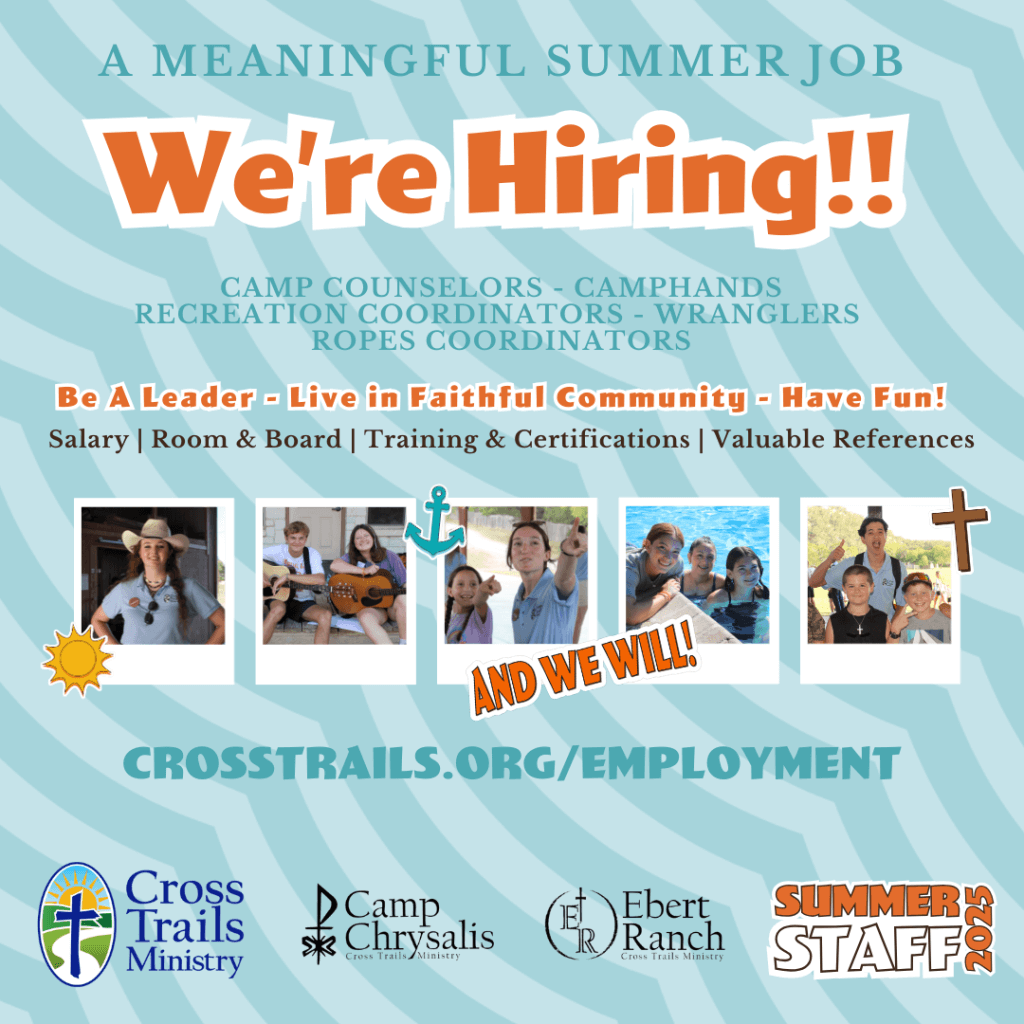 Cross Trails Ministry is a year-round camp and retreat ministry operated by the congregations of the Southwestern Texas Synod of the ELCA. Two sites are at the heart of this ministry: Lutheran Camp Chrysalis in Kerrville and Ebert Ranch Camp in Harper. They are looking for graduating high school seniors and older to apply to be a part of the upcoming summer season. Candidates must commit to 2 weeks of staff training and at least 4 weeks of programming between June 8th and August 3rd – if you have availability questions, just ask!