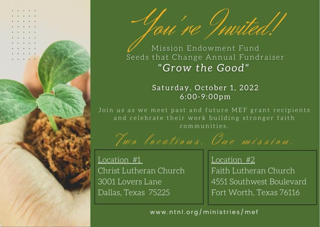 Grow the Good. The 2022 Seeds That Change annual fundraiser will be held at TWO locations on Saturday, October 1, 6-9pm: Christ, Dallas, and Faith, Fort Worth.