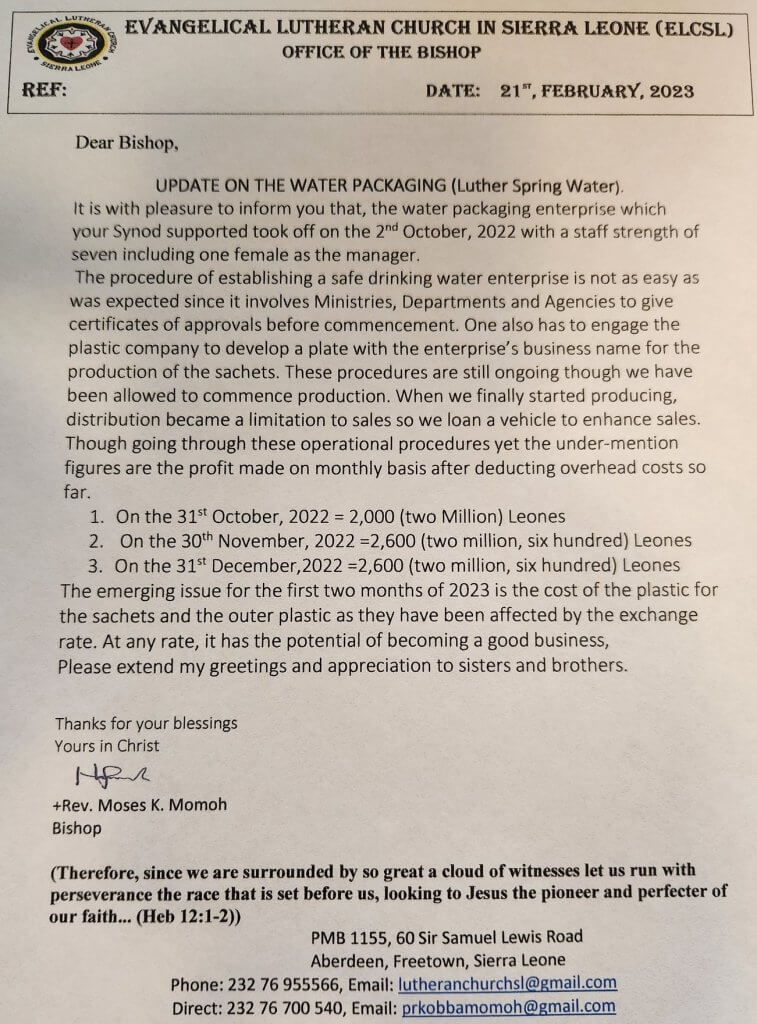 When Bishop Momoh visited NT-NL Synod, ELCA last August he put forward a proposal for a sustainability and leadership development project in the Evangelical Lutheran Church in Sierra Leone. This project involved purchasing a water bottling machine to harvest and bottle clean water for sale in Freetown. Our synod council approved a $20,000 investment into this project to provide start up capital and the machine they needed.