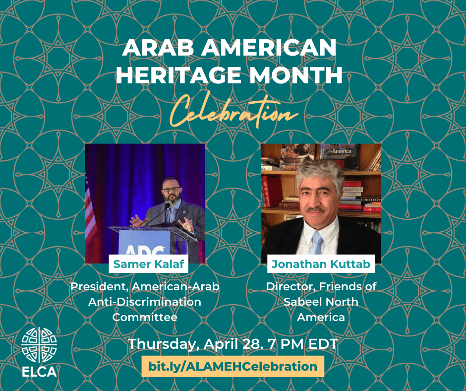 April is Arab American Heritage Month. The Association of Lutheran of Arab and Middle Eastern Heritage (ALAMEH) is hosting an online celebration on Thursday, April 28 at 7 p.m. Eastern time. The event will feature speakers Samer Khalaf, national president of the Arab American Anti-Discrimination Committee, and Jonathan Kuttab, executive director of Friends of Sabeel North America. Join us to discuss Arab American heritage in the United States, advocacy, justice, combating discrimination, and more. Register here: bit.ly/ALAMEHCelebration