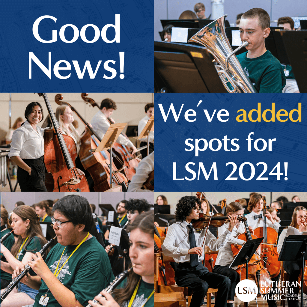 Final openings are available for the four-week Full Session (June 30-July 28) for students in grades 8-12 who play clarinet, flute, horn, oboe, trumpet, euphonium, violin, or string bass. Contact LSM Admissions for questions or to refer students: admissions@lutheransummermusic.org. For more information or to apply, visit LSMacademy.org.