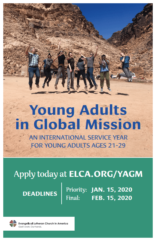 If you know young adults age 21 to 29, this is the time to reach out. Encourage them to apply for YAGM by the priority deadline of Jan. 15, 2020. Talk to them personally about what this opportunity will mean for their faith, identity, career, and understanding of God’s work in the world. You can also print out this poster to display in your congregation or ministry space.