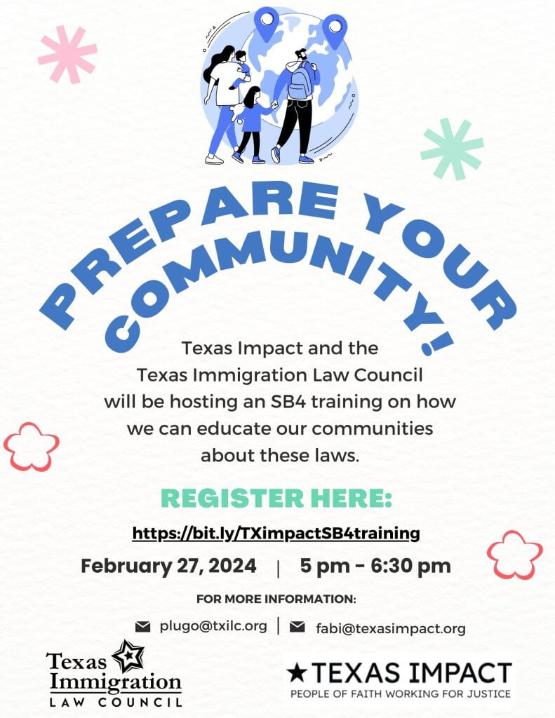 Texas Impact in collaboration with the Texas Immigration Law Council will be hosting an informational webinar on SB4 (88-4) on February 27th at 5pm. Register for the webinar here.