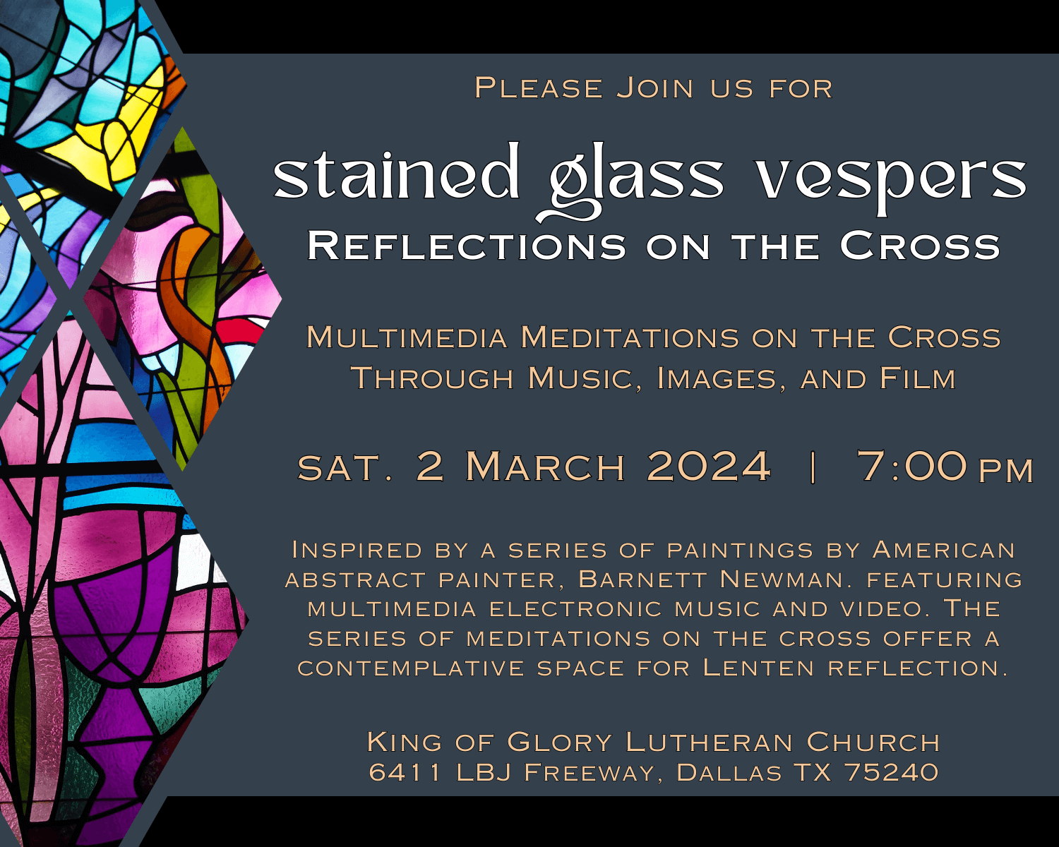 Stained Glass Vespers is an event series that celebrates the intersection of fine arts and spirituality brought together with the liturgy of evening prayer, also known as Evensong. Inspired by the sanctuary’s stained-glass windows, designed by Cecil Casebier, each event features a different art form, such as music, literature, film, sculpture, painting, architecture, or performance.