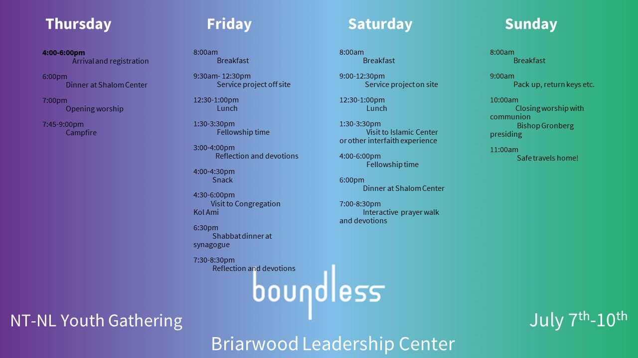 Meals will be provided starting with dinner on Thursday through breakfast on Sunday as well as overnight accommodations. Events will start Thursday in the late afternoon and end with worship led by Bishop Gronberg on Sunday morning. Service projects and interfaith growth experiences will help us learn and grow in understanding of our Boundless God. See tentative schedule below.