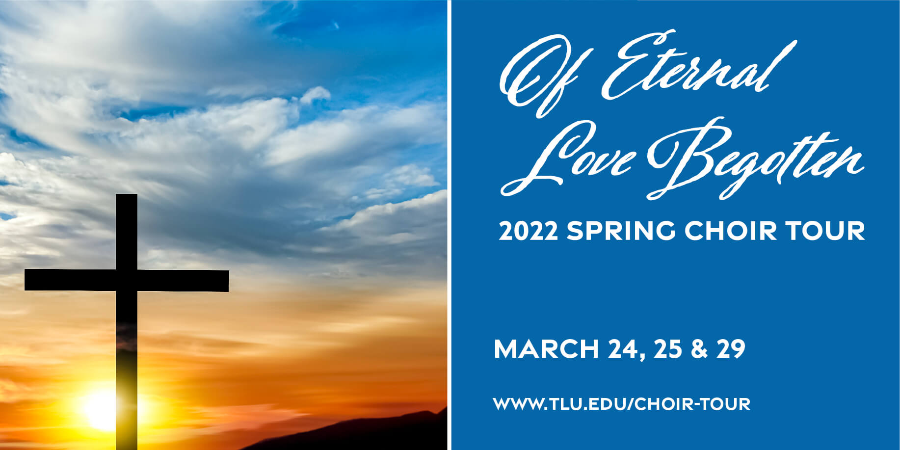 The TLU Choir will be performing their Spring Tour, Of Eternal Love Begotten, at Trinity Lutheran, Ft. Worth on March 24; St. John, Bartlett on March 25; and the Texas Lutheran University Chapel of Abiding Presence, Seguin on March 29. All concerts will begin at 7 p.m. Additional information may be found at https://www.tlu.edu/events/spring-choir-tour-2022.