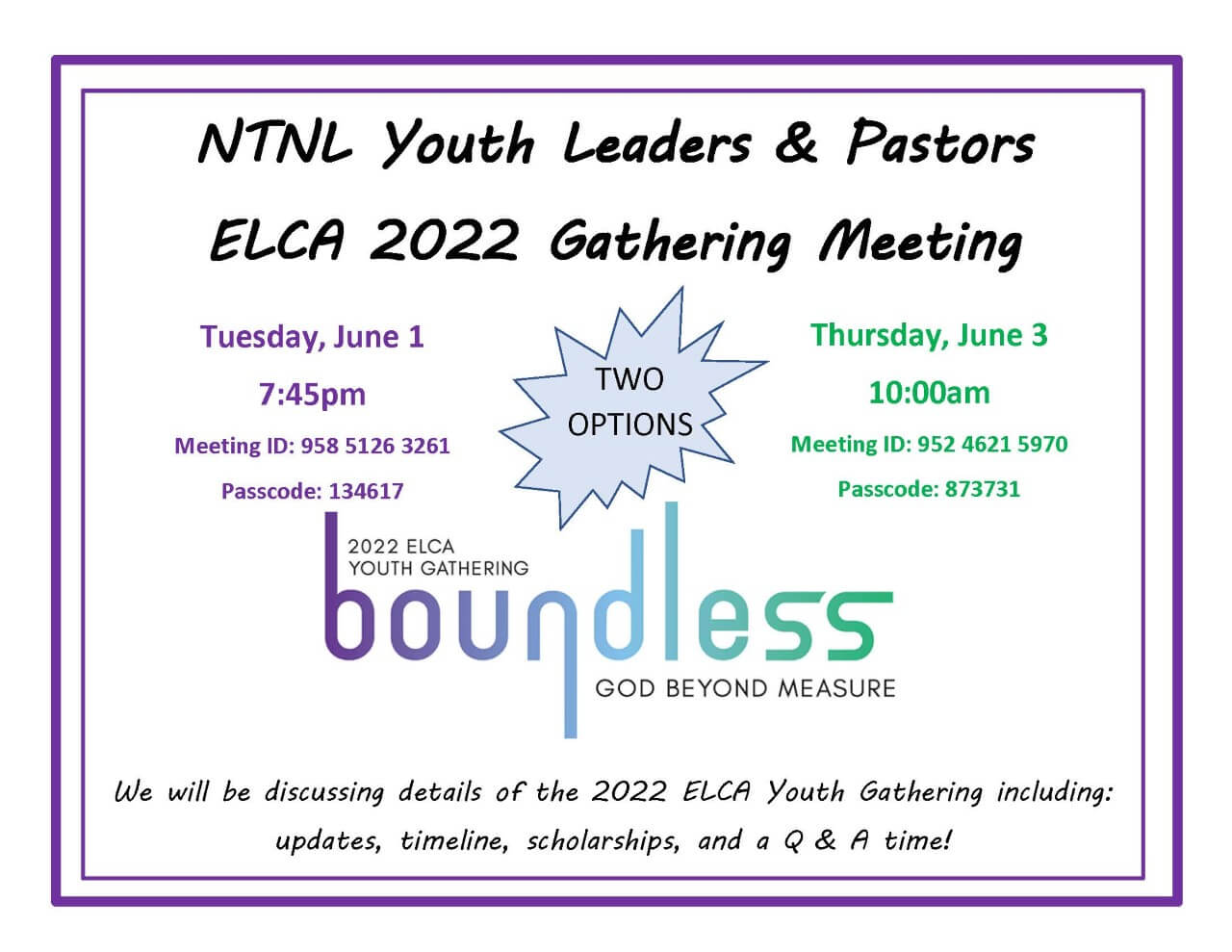 It is time to RESTART our planning for the 2022 ELCA YOUTH GATHERING! Please plan on attending one of these two informational meetings. If one of these times does not work, please contact me so we can set something up. – Janelle Miller, NT-NL ELCA Gathering Synod Coordinator, janellemiller@yahoo.com