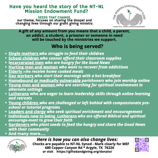 The NT-NL Mission Endowment Fund (MEF) is seeking $10,000 to help us reach our 2021 goal. Please consider being a part of our grant giving ministry that changes lives with your financial support. https://giftedandgiving.org/donate/