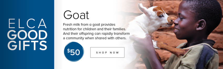 With ELCA Good Gifts, your members and their friends can choose from more than 50 life-changing, charitable gifts – such as a pair of goats, school fees, or a water well – and give a gift the world needs. Each gift can be given in honor of a friend or loved one and goes on to create transformative change in the lives of people in need.