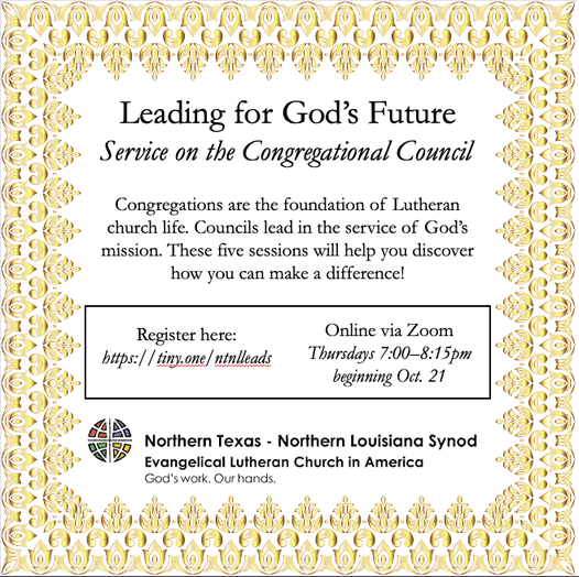 - Oct. 21: Leading for God’s Future: Service on the Congregational Council – Session 1, Zoom