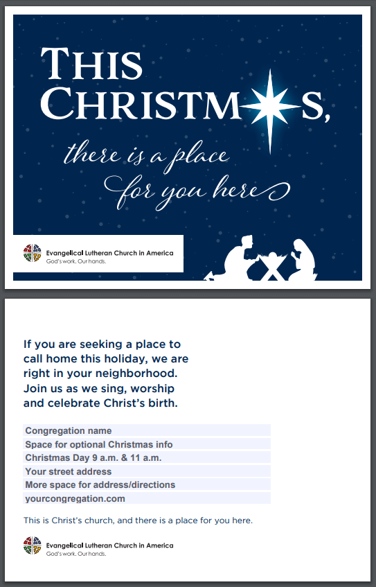 The ELCA offers a place of welcome for all seeking a congregational home. Your congregation can extend an invitation to neighbors and the surrounding community through the use of these customizable communications tools for Christmas in English and Spanish. Download and use these free tools today.