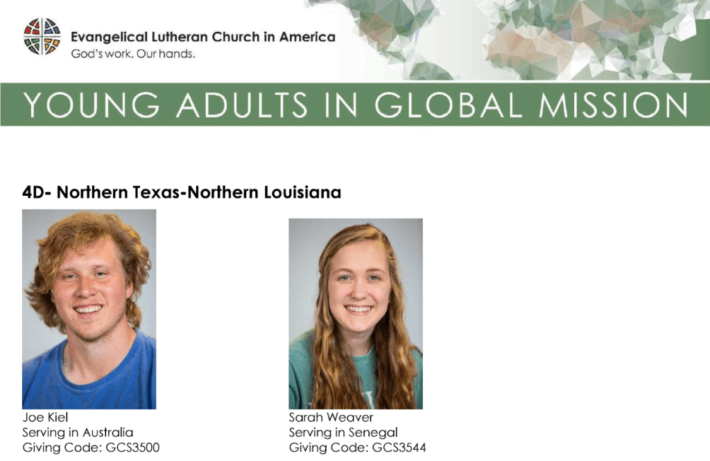 We invite your prayers as they begin their journeys and as they continue to discern God’s call in their lives. Each YAGM volunteer commits to raising $5,000 for their year of service, and additional contributors to the ELCA help support the additional $10,000 per young adult in program costs. If you feel called to support either or both of these NT-NL young adults, and/or any other YAGM volunteers, you may do so here.