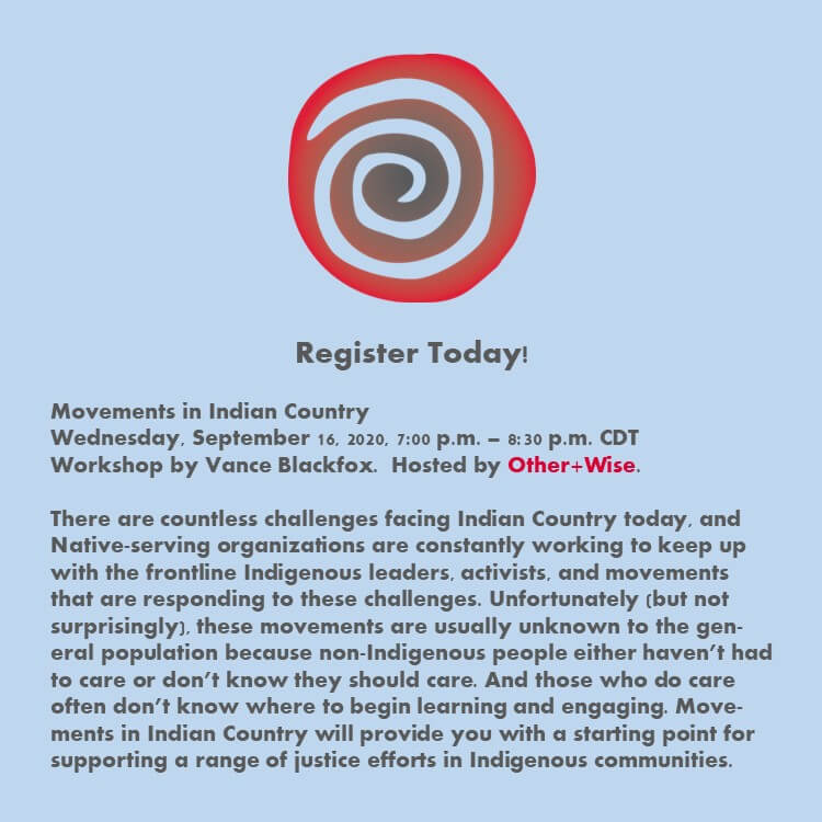 Please join Other+Wise and our promotional partners, ELCA Coaching, New Story Festival, and Briarwood Leadership Center, for the next Indigenous-centered Zoom workshop with our founder and director, Vance Blackfox.