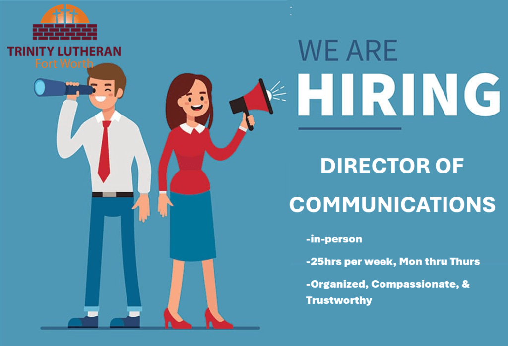 Trinity, Fort Worth is seeking a Director of Communications to manage their print and electronic communications, manage their social media pages, monitor their webpage, provide a welcome to those arriving on site, and communicate with the pastor about pastoral needs. This is a salaried position of 25 hours a week with compensation in the range of $27,000-$32,000 per year, depending on experience.