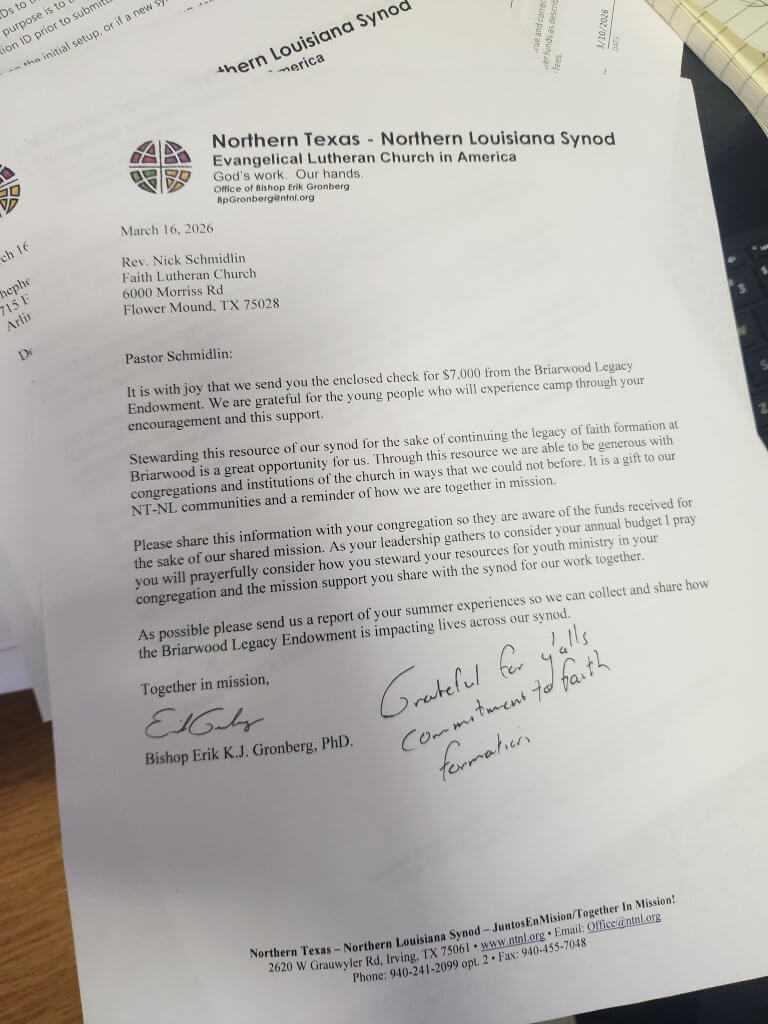 The investment we in NT-NL made in Briarwood continues to pay dividends for our synod. Rather than asking for financial support we are now able to generously share God’s abundance with our communities and support camping in Texas and most importantly faith formation in our congregations.